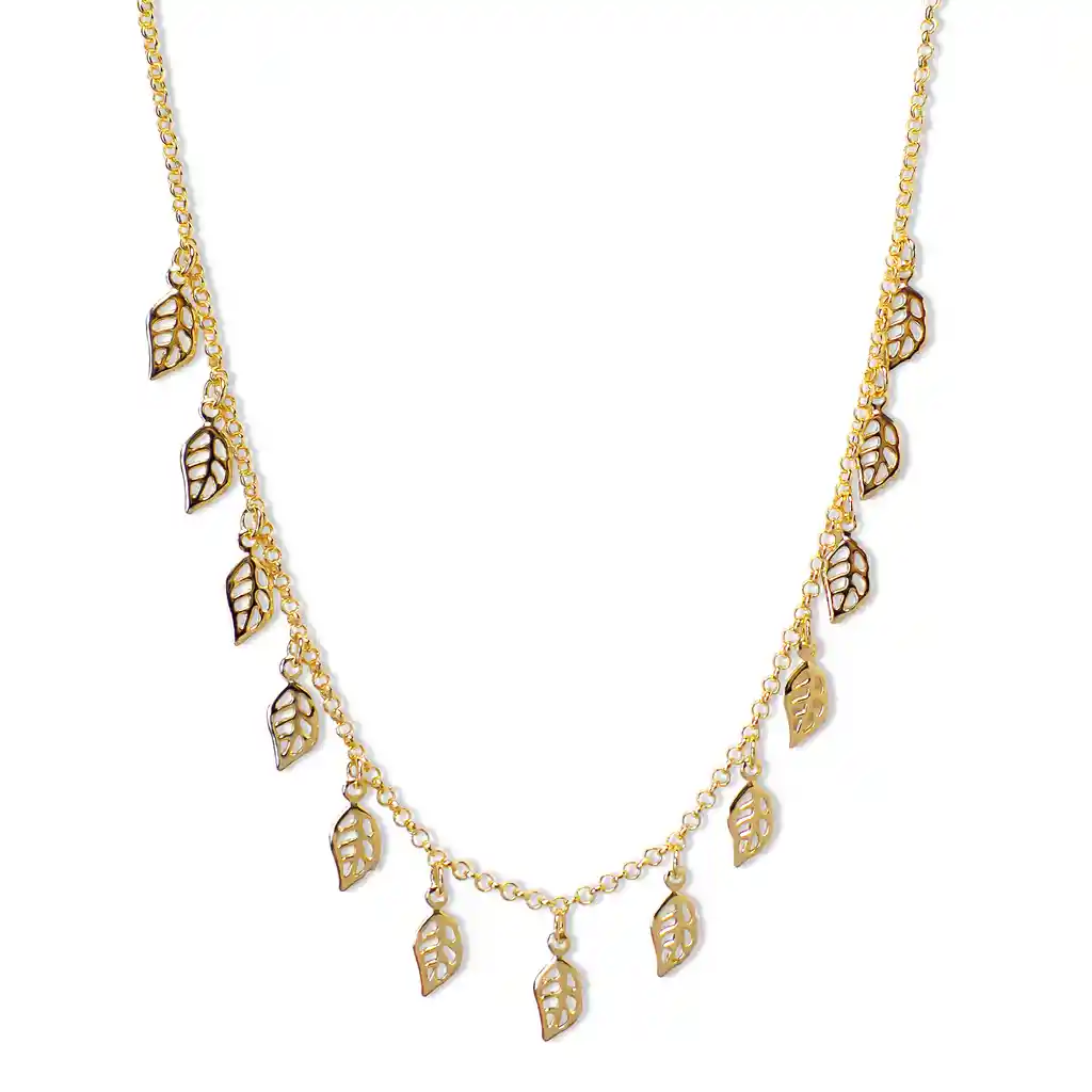 Collar choker hojas caladas cadena enchapado en oro de 18K. Fabricado en bronce enchapado en oro. Hipoalergénico, libre de níquel y su calidad es totalmente garantizada. Sus medidas son un largo de 35+7cm de cadena de extensión. Las hojas son de 10mm de largo y 6mm de ancho. Tiene un peso de 5,4 gr.