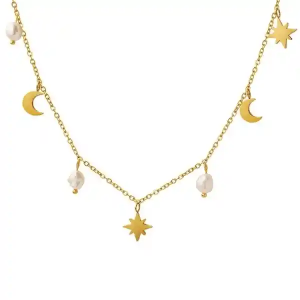 Collar hecho de Acero. Bañado en oro. Perla Natural. Largo cadena: 40 cm más 5 cm de extensión Libre de níquel y plomo. Incluye elegante caja.