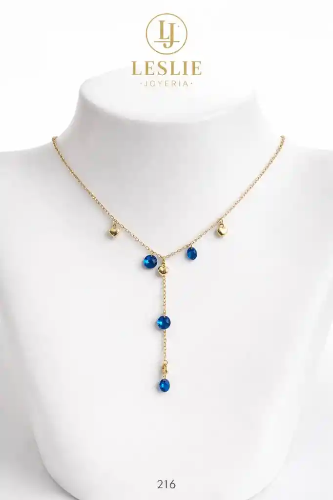 Collar con cristales azules y corazones laminado en oro de 18k mide 42cm+5cm .