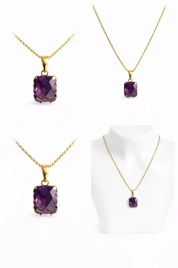 Collar con dije colo morado laminado en oro de 14k mide 50 cm y el dije 2 cm.