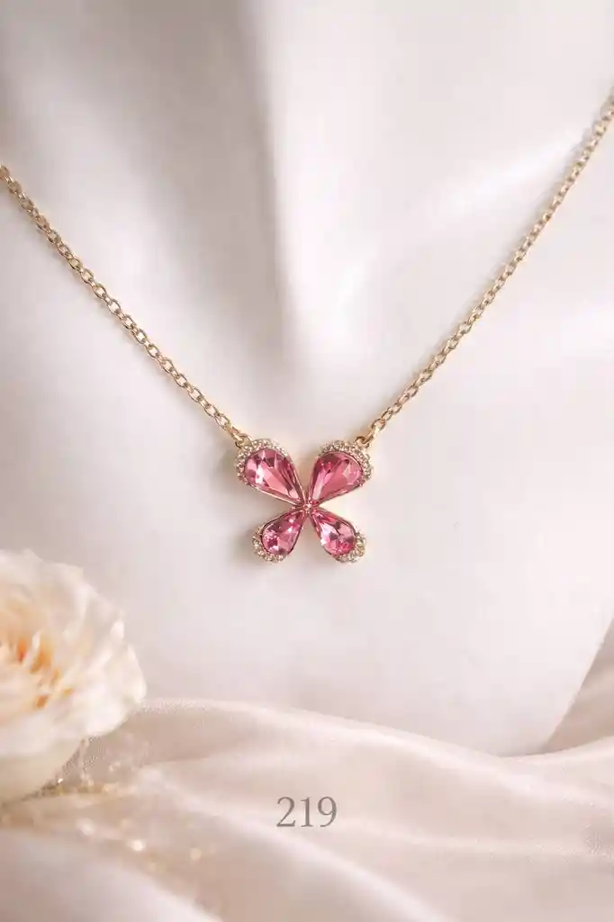 Collar de flor con cristales fucsias y micro circones laminado en oro de 18k mide 40cm + 5cm de extensión.