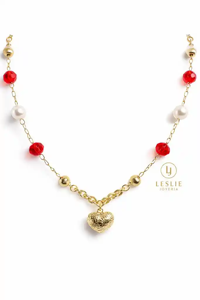 Collar con perlas y cristales rojos con un corazón laminado en oro de 18k mide 47cm.