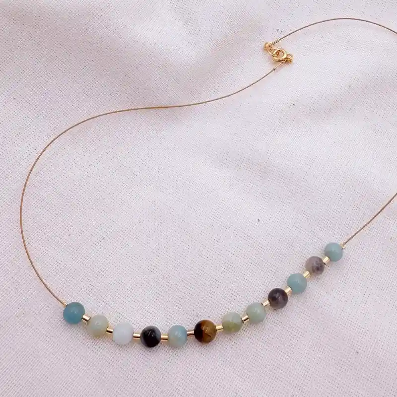 Collar Caroco corto, con piedras naturales en mix de tonos tierra: Agatas y Amazonitas naturales pequeñas intercaladas con mostacillas doradas, todo sobre un hilo de acero dorado flexible y resistente. El collar mide 43cm. de largo total abierto. Material: bronce bañado en oro de 18k.