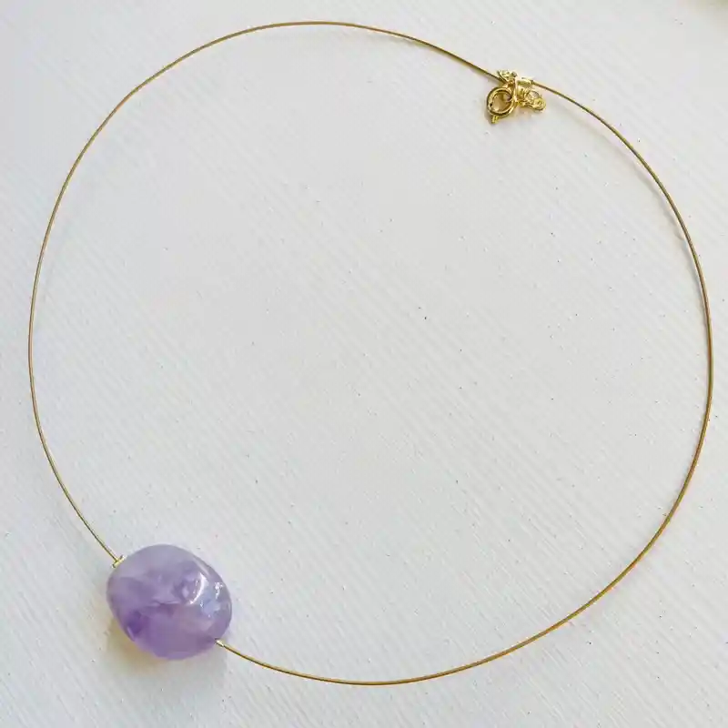 Collar Caroco con un Cuarzo Amatista grande solitario sobre acero dorado flexible. El collar mide 42cm. en total Material: terminaciones de bronce bañado en oro de 18k.