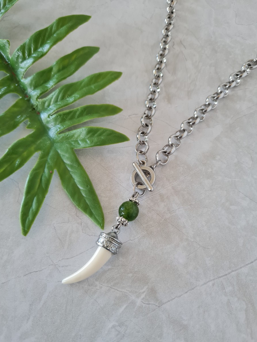 Ondero collar corto con cuerno blanco, ágata verde y cadena gruesa de eslabones. La cadena mide 47 cm. El collar completo mide 52 cm. Se entrega envuelto en un papel seda dentro de una preciosa cajita. Perfecta para regalar y quedar como reina.