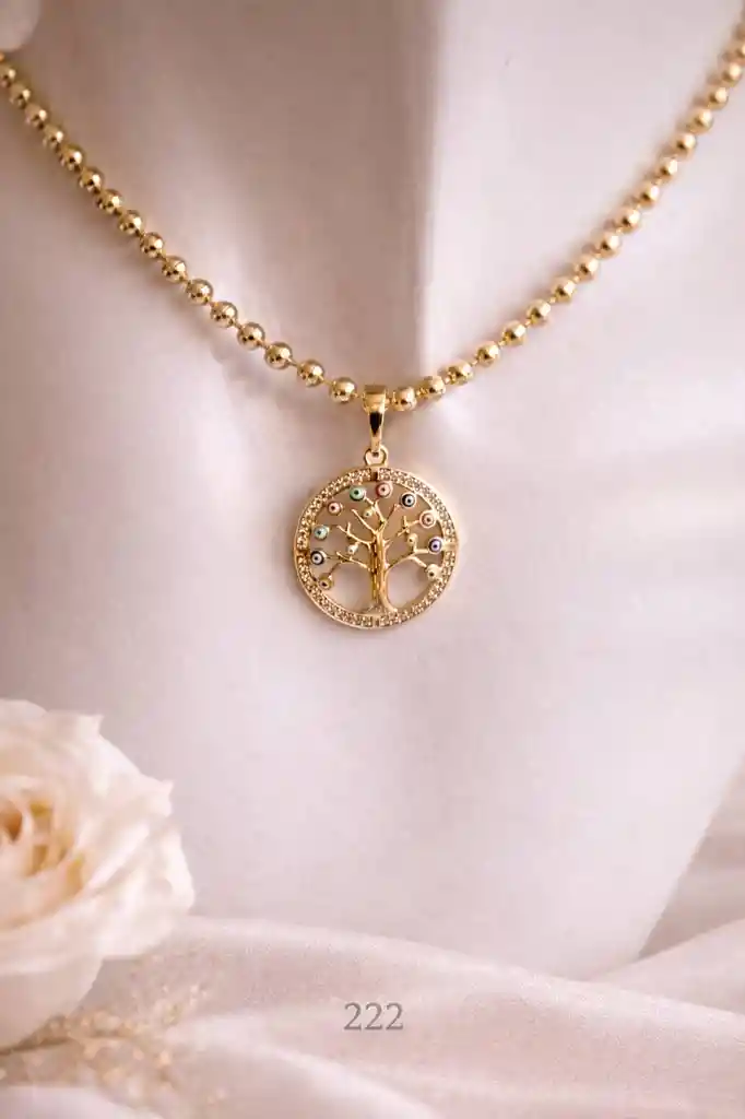 Collar de balines y dije de árbol de la vida con ojos turcos y micro circones laminado en oro de 18k mide 45cm