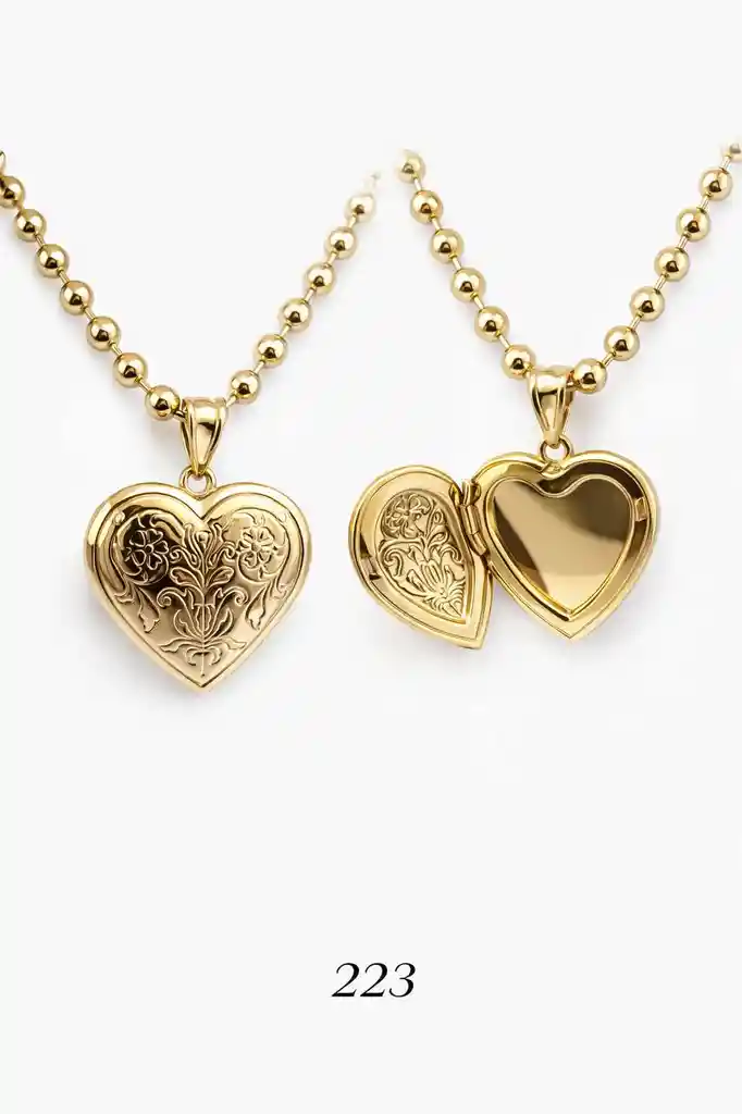 Collar de balines y relicario tallado laminado en oro de 18k mide 50cm