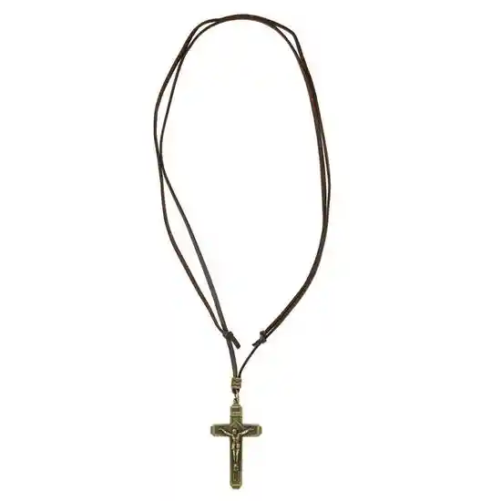 Collar Colgante de Cuero Ajustable Con Crucifijo Acero Efecto Envejecido. Largo Ajustable