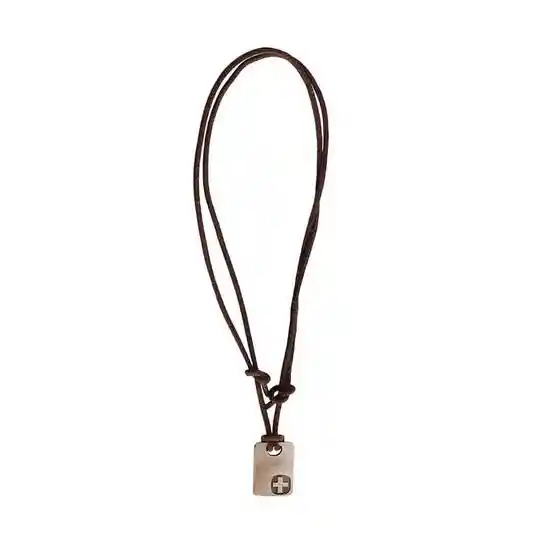 Dije Tipo Placa (Dog Tag) Con Cruz Grabada en la Esquina. Placa Con Efecto Envejecido. Nudo Deslizable Para Ajustar el Largo Del Collar. Especificaciones: Tamaño Dije: 3 cm x 22 cm. Largo: 21 43 cm. Color: Plateado. Material: Ecocuero y Metal. 3 cm x 22 cm.