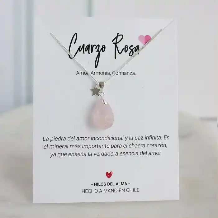 Collar de plata 92,5 con piedra natural Cuarzo Rosa Amor, Armonía y confianza. La piedra del amor incondicional y la paz infinita. Es el mineral más importante para el chacra corazón, ya que enseña la verdadera esencia del amor 100% Hecho a mano. Material: Plata 92.5 Cadena de 45cm Para mantener tus joyas de plata recuerda siempre guardarlas en un lugar seco y hermético. Mantenlas fuera de contacto de productos como cremas y perfumes. Usa un paño especial no abrasivo para que no se rayen y límpialos con productos especializados.