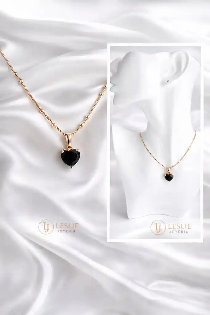 Collar con dije de corazón negro laminado en oro de 18k color rose mide 45cm.