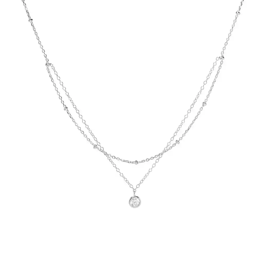 Delicado collar doble con cadena de pelotitas y otro collar de punto de luz. Está fabricado en Plata 925. ¡Todas nuestras joyas vienen con un packaging especial que te enamorará! Medidas: 40 cms + 5 cms de extensión