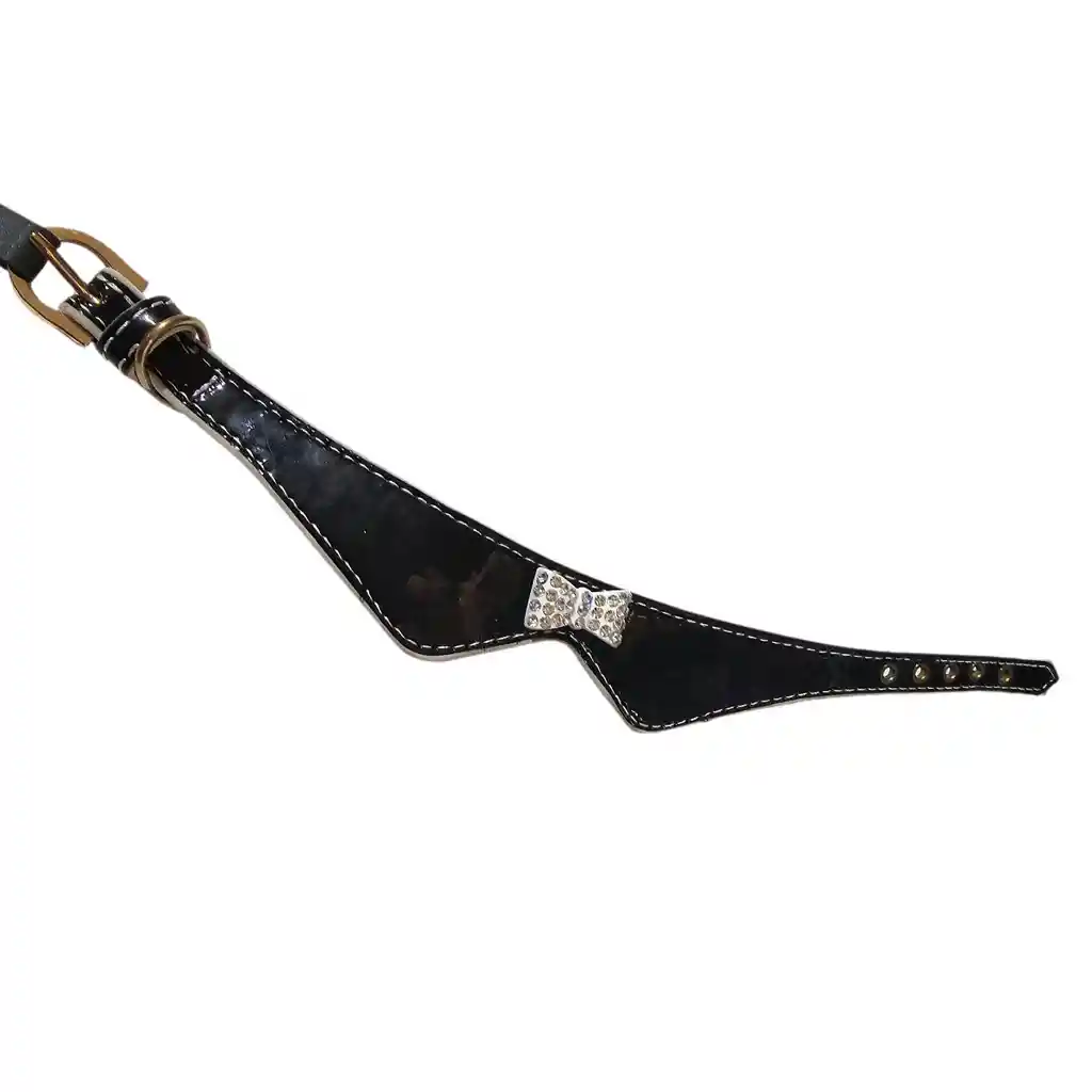 Con una Forma Preciosa y un Lazo con Diamantes este collar será una elegancia para tu peludit@ Eco cuero de Excelente Calidad Brillante Lazo con diamantes brillantes Broche de cierre de metal resistente y dorado Collar de 30cm de largo con reducción hasta 22cm