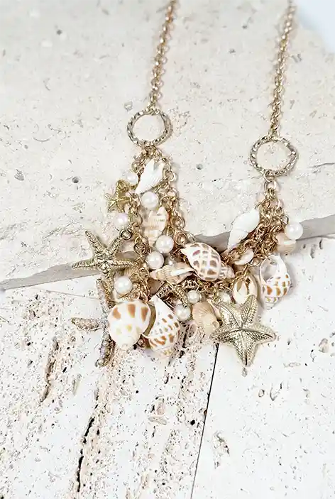 Este collar captura la esencia del océano con su variedad de colgantes que incluyen conchas naturales, perlas de acrílico, y una estrella de mar metálica, todos colgando de una cadena de eslabones unida por argollas con efecto martillado. La mezcla de elementos marinos y el detalle brillante de las perlas hacen de este collar una pieza llamativa y llena de vida.