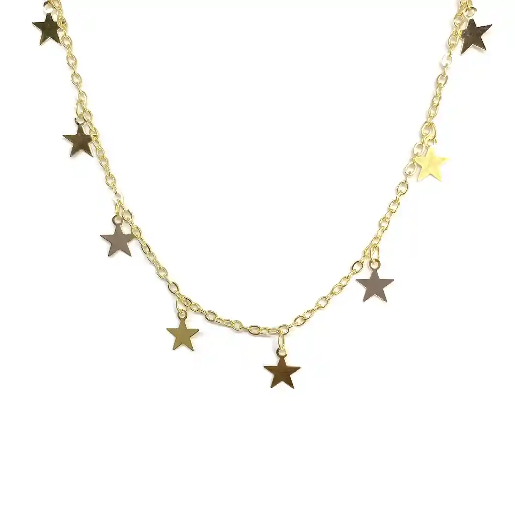Collar estrellas enchapado en oro de 18K. Fabricado en bronce y enchapado en oro 18K. La calidad del material es garantizada. Tiene una aleación de metales y no posee níquel. El material es hipoalergénico. Sus medidas son 45cm de largo en total del collar. Las estrellas son de 7mm de diámetro. Tiene un peso de 2,7 gr.