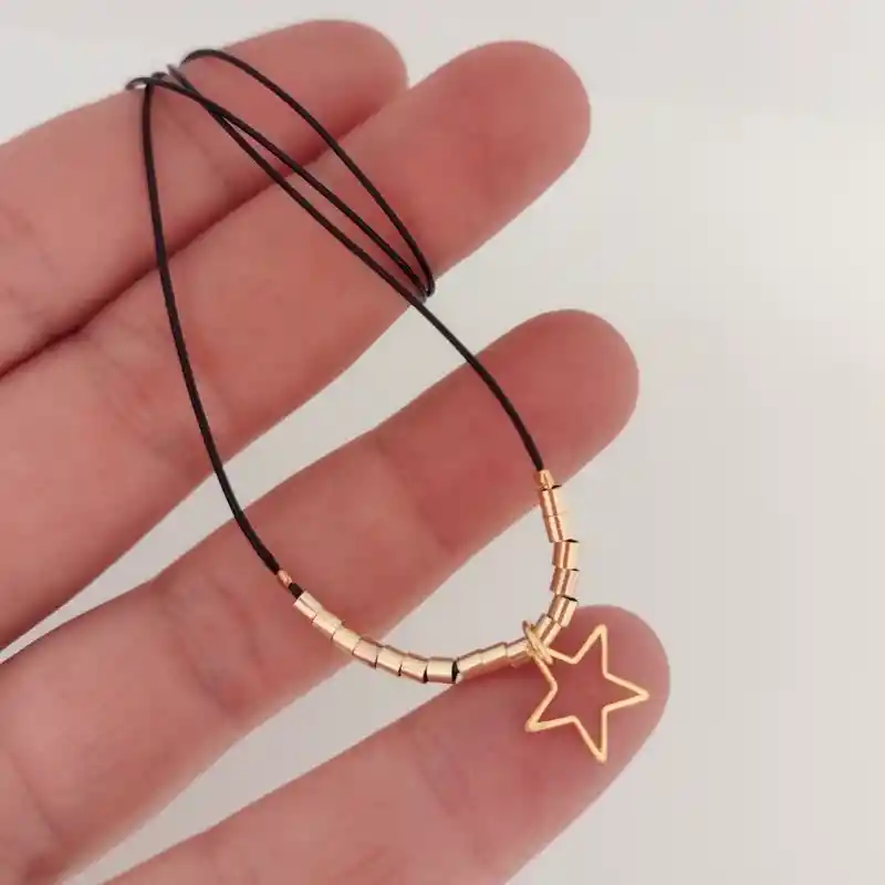 Collar estrellita y mostacills doradas sobre hilo negro flexible y resistente. Largo 42cms.
