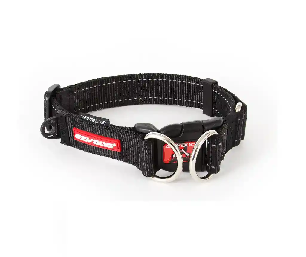 Coller EzyDog modelo Doble Up | Color Negro | Talla L. Doble Fuerza y Doble Seguridad | Doble anillo de acero inoxidable para enganchar la correa | Tejido Reflectante| Súper Resistente. Color Negro. Circunferencia de cuello entre 39 cm y 59 cm ajustable.