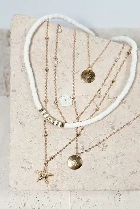 Collar doble, ideal para usar juntos o por separado. El primer collar, combina mostacillas de silicona blancas con detalles dorados en el primer collar, añadiendo un toque casual y luminoso a tu estilo. El segundo collar es una cadena de eslabones dorados con pelotitas, con tres niveles de diferentes longitudes, decorada con colgantes de metal, acrílico, e imitación de perlas que añaden un encanto único.
