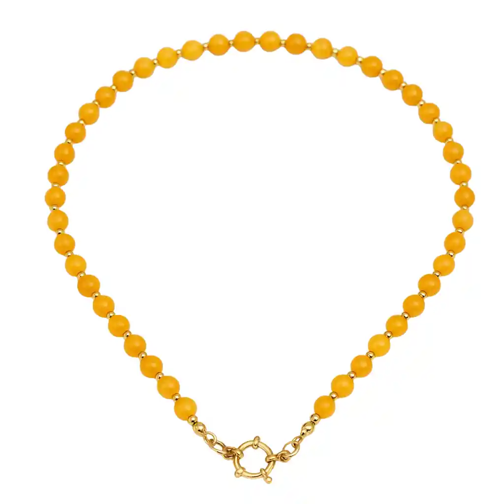 El collar de aragonita de la colección Terranova representa equilibrio, serenidad y conexión con la tierra. Sus cuentas naturales de aragonita de 6mm irradian una energía cálida que invita a la calma interior y a mantener los pies firmes en momentos de cambio. Su tono miel dorado, combinado con el brillo del chapado en oro 18K, lo convierte en una joya que transmite armonía, elegancia y poder natural. 💎 Un amuleto de calma y fortaleza Armonía y estabilidad: la aragonita ayuda a equilibrar emociones y liberar tensiones, aportando serenidad y claridad mental. Energía terrenal: promueve la paciencia, la empatía y la resiliencia, recordando la importancia de mantener el equilibrio frente a los desafíos. Protección energética: ideal para quienes buscan reconectar con su esencia y encontrar bienestar interior. Astrología: asociada con Tauro, Virgo y Capricornio, potencia la fortaleza emocional y el vínculo con la naturaleza. ✅ Características principales Piedras: cuentas de aragonita natural de 6mm. Separadores: cuentas chapadas en oro 18K que aportan brillo y contraste. Cierre: tipo timón chapado en oro 18K de 12mm de diámetro externo, resistente y elegante. Medidas: largo aproximado de 45 cm. Diseño artesanal: elaborado a mano, con ligeras variaciones naturales en color y forma que hacen de cada pieza algo único. Es importante que sepas que por tratarse de un producto hecho a mano y ser confeccionado con piedras naturales puede haber leves diferencias de color y tamaño por el corte de las piedras. Cada uno de nuestros collares son unicos, tal como tu. 🎁 Presentación ideal para regalo Cada collar se entrega en una hermosa presentación para regalo, perfecta para sorprender a alguien especial o para consentirte con una joya cargada de energía positiva. 🌟 Una joya que equilibra energía y elegancia Este collar no solo destaca por su belleza natural y su diseño refinado, sino también por su profundo simbolismo de estabilidad y conexión con lo esencial. Es el accesorio perfecto para acompañarte con confianza y calma, reflejando la luz dorada de tu energía interior. 🚀 Hazlo tuyo hoy Combina la energía protectora de la aragonita con la sofisticación del oro 18K en una pieza que simboliza equilibrio, serenidad y estilo. 👉 Agrega al carrito ahora y conecta con la energía cálida y armónica de la aragonita.