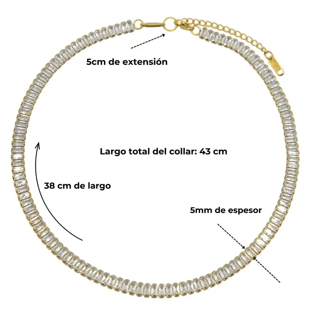 Collar Gargantilla Tennis Chapado en Oro 18K | Un Clásico Que Nunca Pasa Desapercibido. Hay accesorios que adornan. Y hay otros que transforman. Este collar estilo tennis chapado en oro de 18 quilates pertenece a esa categoría de joyas que no solo completan un look… lo definen. Inspirado en una historia que marcó un antes y un después en el mundo de la moda, este diseño nace de un instante inolvidable: cuando la tenista Chris Evert detuvo el US Open en los años 80 tras perder su brazalete de diamantes. Desde entonces, la joyería tipo tennis dejó de ser un lujo silencioso para convertirse en un símbolo de elegancia poderosa. ¿Por qué esta pieza es imprescindible? Porque transmite sofisticación con solo una línea de brillo. Cada zirconia de 5 mm refleja la luz como si fuera diamante, creando un efecto continuo que atrae todas las miradas sin esfuerzo. El diseño incluye una cadena de 38 cm + 5 cm de extensión, ideal para ajustarse perfectamente a tu estilo. Material: Acero con chapado en oro de 18K Largo total: 43 cm (ajustable) Piedras: Zirconias blancas de 5 mm Diseño: Estilo tennis con eslabones articulados Esta gargantilla no solo es un accesorio: es una declaración de buen gusto. Su disponibilidad es limitada, lo que la convierte en una joya codiciada por quienes entienden que la verdadera exclusividad está en los detalles. Elegancia que llega para quedarse. Se entrega en una hermosa presentación para regalo, lista para convertirse en tu próximo favorito o en ese obsequio inolvidable. Porque el lujo no se grita, se lleva. Y tú mereces una pieza que diga lo que no todos pueden expresar. ✨ ¿Lista para brillar como nunca? Esta joya no espera. Y tú tampoco deberías.