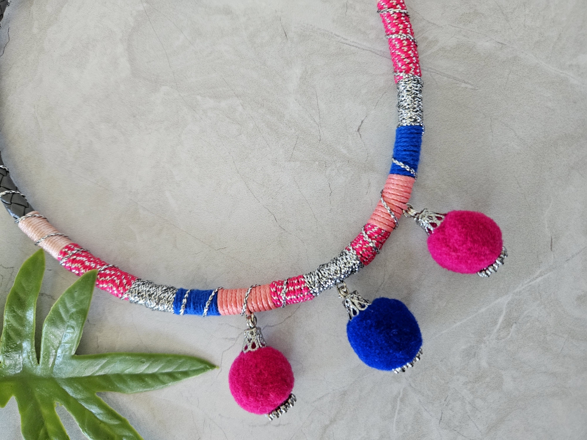 Quieres robar miradas? Este collar completará tu outfit y es imposible que pases desapercibida. Collar de cuero gris embarrilado con hilos en tonos fucsia, rosa, azul, coral y plateado. Pompones fucsia y azul. Diseño único. Hecho a Mano en Chile. Mide 45cm