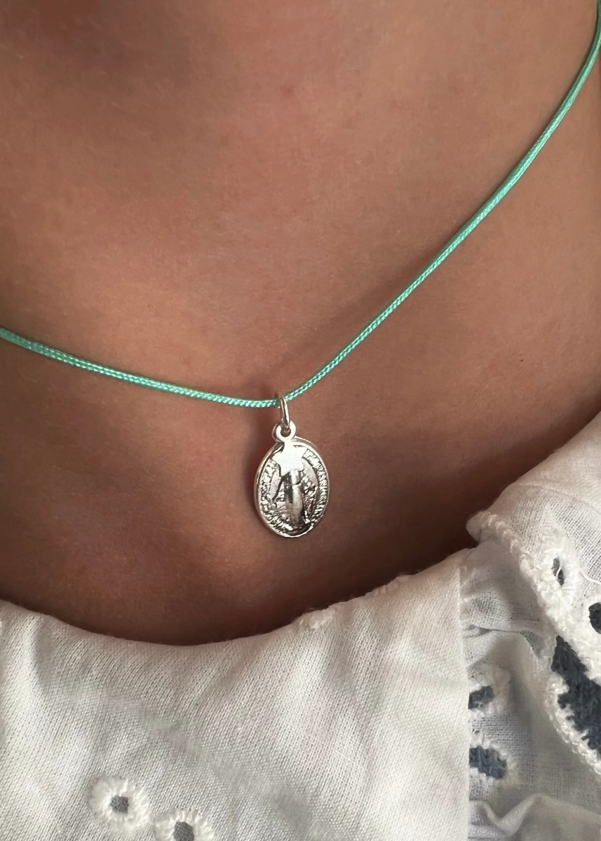 Precioso collar de hilo ajustable con Virgen de los Rayos (conocida como virgen de los milagros) de 13 x 9 mm y estrellita enchapados en plata, libre de níquel e Hipoalergénica.Puedes elegir el color del hilo, gris o verde agu