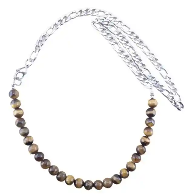 Collar Hombre de piedra natural de ojo de tigre, bola lisa 0,8 cm. Broche y conectores de Acero Inoxidable. Largo 55cm. Ojo de Tigre: potencia las defensas. Combate el mal de ojo y las energías negativas. Acero Inoxidable: no se oxida ni se ennegrece ante las agresiones diarias: agua, productos domésticos, agua de mar, cosméticos, sudor, etc. El Acero Inoxidable tiene varias ventajas: Es maleable al calor y se puede grabar. Es hipoalergénico. No provoca ninguna reacción en la piel, salvo en casos muy raros. Es ecológico. Su impacto en el medio ambiente es bajo, ya que no libera níquel. Es prácticamente indestructible e indeformable. Requiere poco mantenimiento. 100% reciclable. Incluye: bolsa de regalo Cambios: 1 mes Garantía: 3 meses