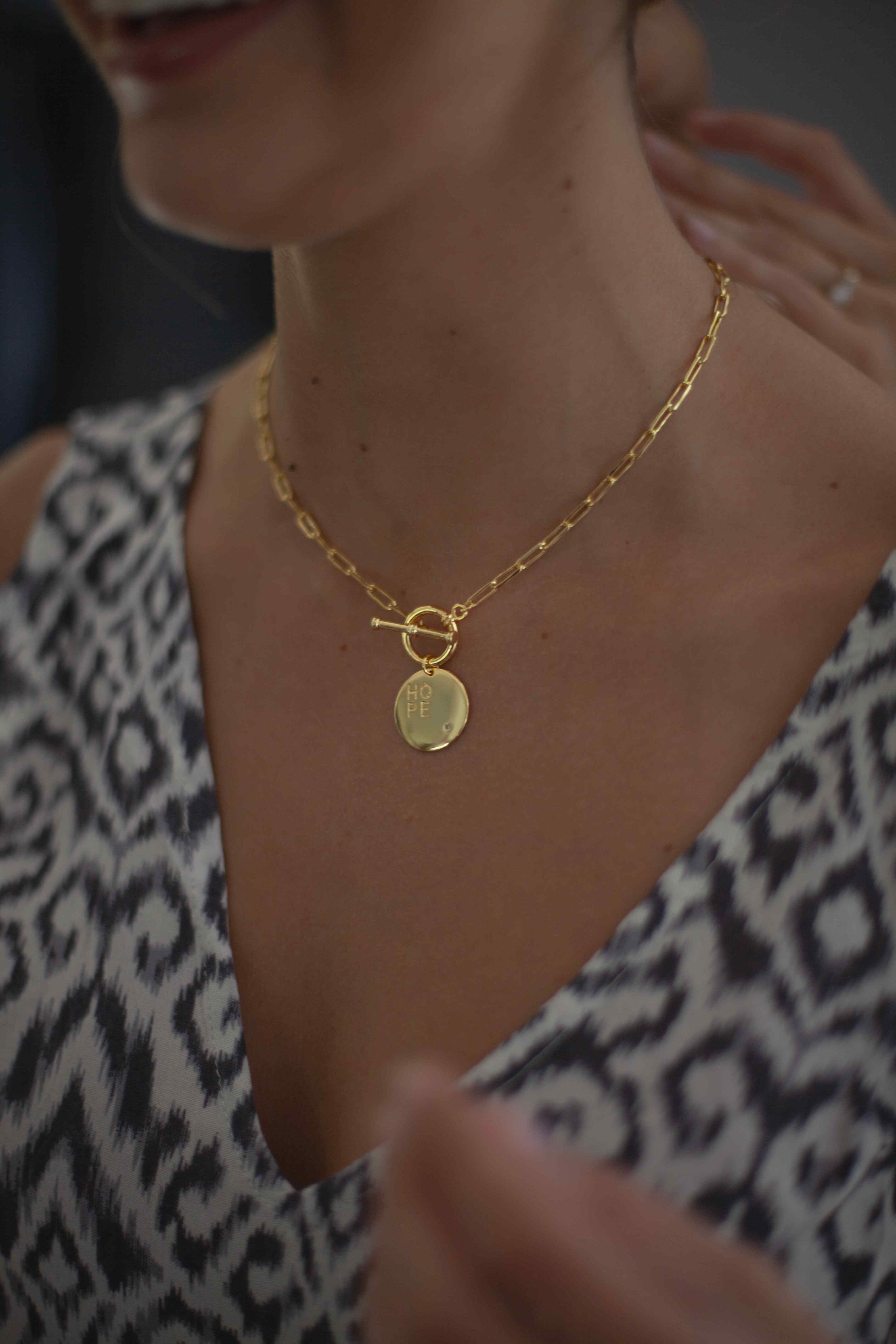 <p><meta charset="utf-8"><span>Lleva</span><span> </span><span>un pedacito de</span><span> esperanza a todas partes contigo con el collar Hope en su versión original. </span><span>Es también el regalo perfecto para quien necesita esa esperanza </span><span>y paz en su vida.</span></p><p><strong>Medidas: </strong>Cadena 45cm / Colgante 2cm diametro</p><p><strong>Materialidad: </strong>Colgante de plata bañado en oro 18k, cadena bañada en oro 18k.</p><p><strong>Color: </strong>Gold</p><blockquote><p><span style="color: #80a57f;">I HOPE</span></p><p style="text-align: left;"><em>“iHope”, </em><em>fue creada para llevar la esperanza a todas partes y contagiarla a quienes<span> </span>también necesitan un pedacito de ella.</em></p><p style="text-align: left;"><em>Nuestra creadora, Juanita Lira quien descansa en paz, luego de haber sido diagnosticada cáncer de mama a sus 22 años, vivió momentos de incertidumbre y miedo, pero gracias al apoyo de su familia, amigos, cercanos y la motivación de salir adelante, pudo vivir con un propósito que le llenó el alma, feliz y esperanzada.</em></p><p style="text-align: left;"><em>Estaba enamorada de este proyecto “iHope” y espero que todos los pedacitos de esperanza puedan llegar a muchas personas. Quizás no podemos cambiar</em><br><em>esas adversidades o circunstancias difíciles que nos presenta la vida, pero si</em><br><em>podemos cambiar la actitud con que las enfrentamos y las vivimos.<br><br>Debes considerar que el cuidado de tu pedacito de esperanza es clave, evita bañarlo, perfume e intenta sacártelo para hacer deporte y dormir.</em></p></blockquote>