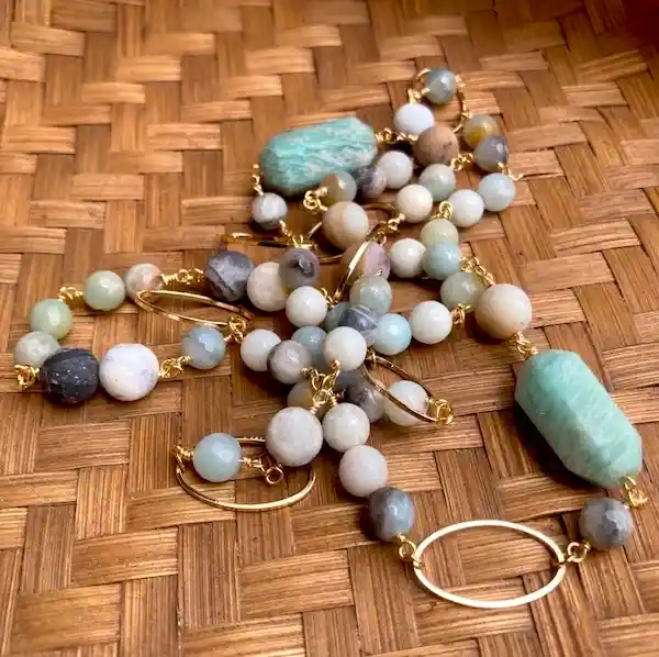 Collar Caroco largo dorado bañado en oro de 18k. con piedras naturales Amazonita y Agata en tonos verdes claros y tierra. El largo total del collar es de 1metro.