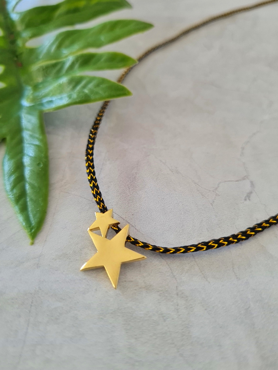Collar ideal para combinarlo con otros collares. Atrévete a mezclar! Este collar es de doble estrella bañada en oro e hilo Chocolate con toques dorados que te harán brillar. Con sistema de cierre ajustable.