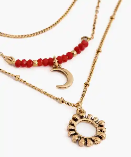 Dorado de Tres Capas Una Simple Otra Con Mostacillas Rojas y Colgante de Luna y Otra Con Colgante de Sol.