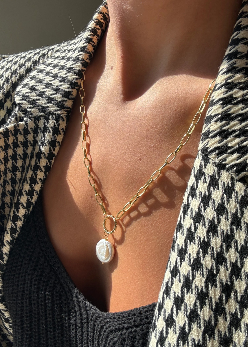 Este collar es una bomba!! Lo puedes usar a la altura que quieras, más corto con el cuello despejado o más largo para realzar un look más inviernal. Es precioso!Collar de 50 cm de largo con argolla en el centro y una piedra de nácar colgando de esta de 1.5 cm de diámetro aprox. Hipoalergénico y libre de níque