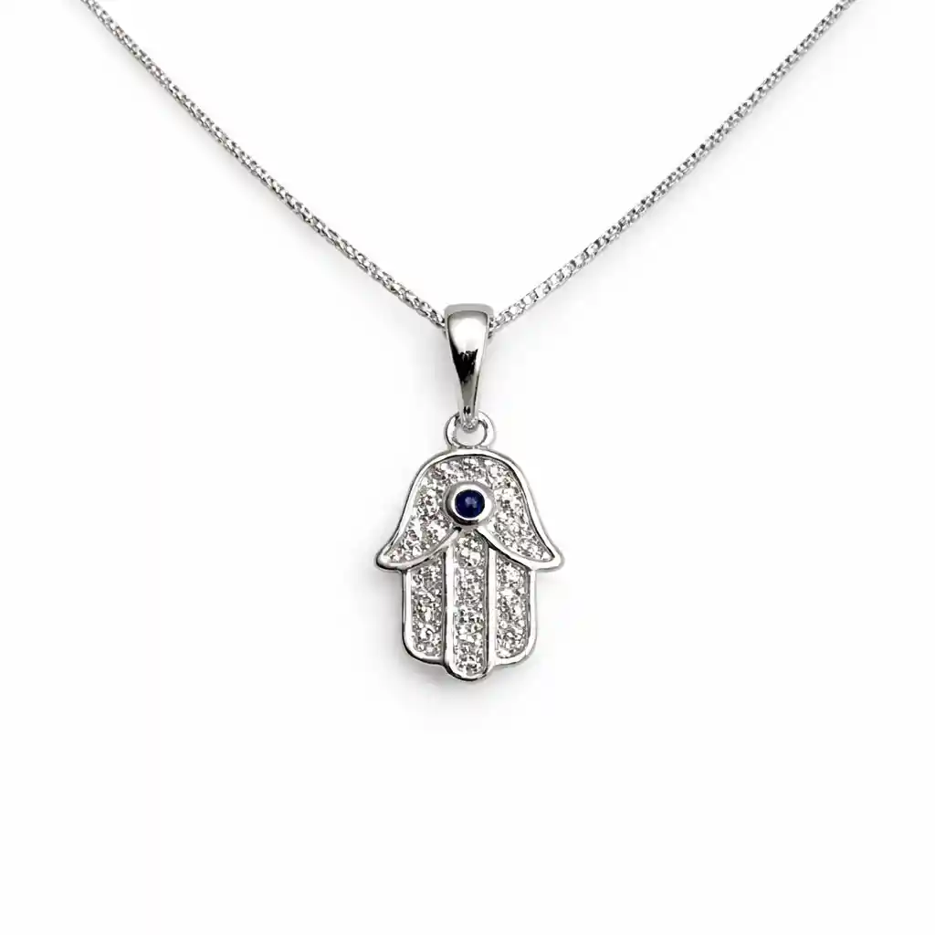 Protege tu energía con estilo gracias a este delicado collar Mano de Fátima en Plata Ley 925, diseñado en un formato minimalista y realzado con un circón brillante azul que aporta luz y elegancia. La Mano de Fátima es un símbolo ancestral de protección, equilibrio y buena fortuna, lo que convierte esta joya en un accesorio perfecto para uso diario o como regalo significativo. Especificaciones: - Material: Plata ley 925 -Medida cadena: 45cm - Medida colgante: 1cm - Presentación: incluye caja elegante, ideal para regalar. - Estilo: Elegante. Lleva contigo un amuleto lleno de significado. ¡Adquiérelo ahora!
