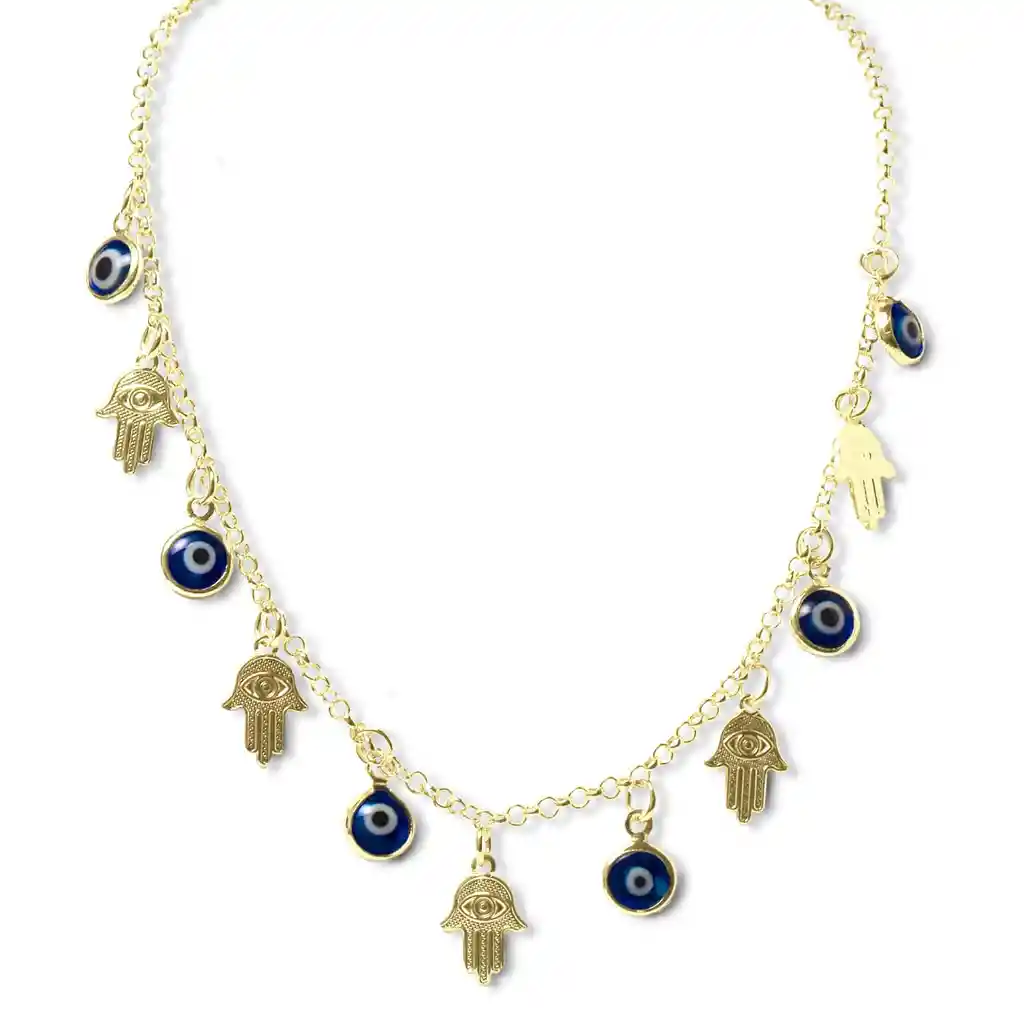 Un collar brinda a toda mujer un toque de feminidad. Collar Manos de Fátima Ojos Turcos cadena Enchapado en Oro 18K. Tiene una aleación de metales, libre de níquel. El material es hipoalergénico. Calidad garantizada. Medidas Largo 35cm y una cadenita de alargue de 7cm para ajustar a la medida.