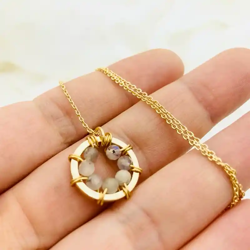 Collar de la marca Caroco. Collar "Manzanilla Tornasol" entorchado con piedras Labradorita naturales, sobre una cadena dorada de 42cm. Material: bronce bañado en oro de 18k. Recomendaciones de cuidado: Mantén tus joyas separadas unas de otras para evitar que se enreden y se rayen. Evita el uso de forma de directa de químicos como perfumes, cremas y productos de limpieza. Guarda tus accesorios limpios en un lugar seco y lejos del sol y la humedad.