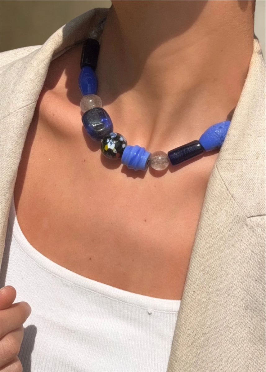 Estamos enamoradas de este collar de cuentas de vidrio hindú pintado en tonos azules. Es la pieza perfecta para agregar color a cualquier estilo!Mide 50 cm y se puede abrochar a distintas alturas. Enchapado en plata, hipoalergénico y libre de níquel