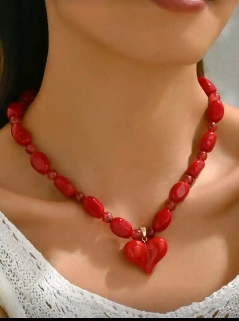 Un collar lleno de pasión y elegancia. Diseñado con cuentas en rojo intenso, este collar destaca por su acabado pulido y su armoniosa composición. Su protagonista es un colgante central en forma de corazón, que aporta un toque romántico y femenino, ideal para realzar cualquier look. Perfecto para quienes buscan un accesorio con carácter, color y significado.