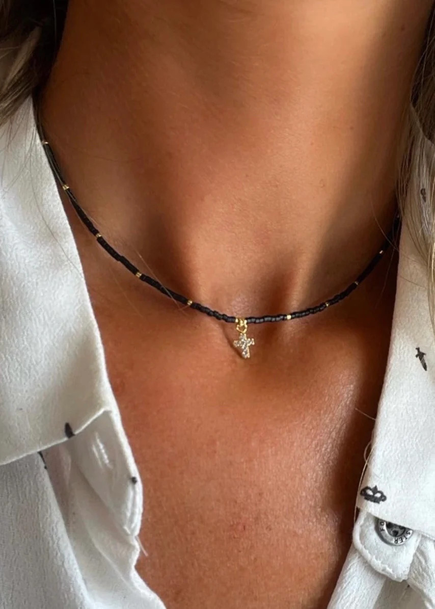 Delicado y sencillo collar de Myuki Delica, mide 40 cm, con colgante de crucecita e incrustaciones de micro circones de 10 x 6 mm incluyendo argollita. Es enchapada en oro 18 kilates, libre de níquel e hipoalergénic