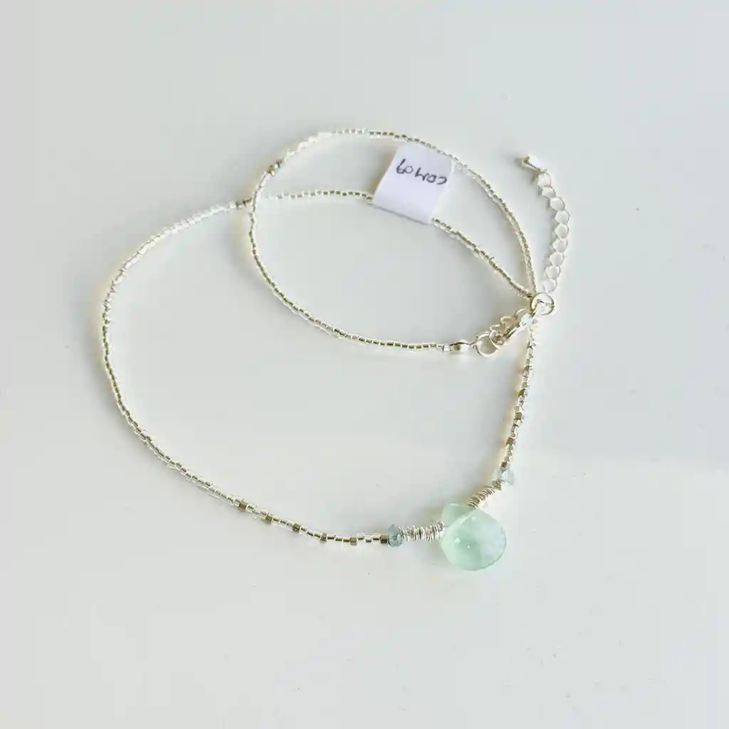 Hermoso y delicado collar hecho a mano por nosotras, con materiales duraderos, resistentes al desgaste, e hipoalergénicos. Ideal para darle un toque especial a tu look. La piedra natural Aguamarina ayuda a tranquilizar el alma y el carácter, y a generar empatía y sensibilidad. Características: Materiales: Piedra Aguamarina en forma de gota. Hecho con piedras naturales, mostacillas japonesas Miyuki, y piezas chapadas en plata libres de níquel. Medida del collar: 40 cm con alargue hasta 45 cm.