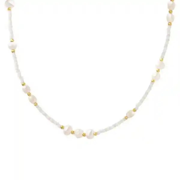 Collar hecho de Acero y perlas Naturales. Bañado en oro. Largo cadena: 37 cm más 7 cm de extensión Libre de níquel y plomo. Incluye elegante caja.