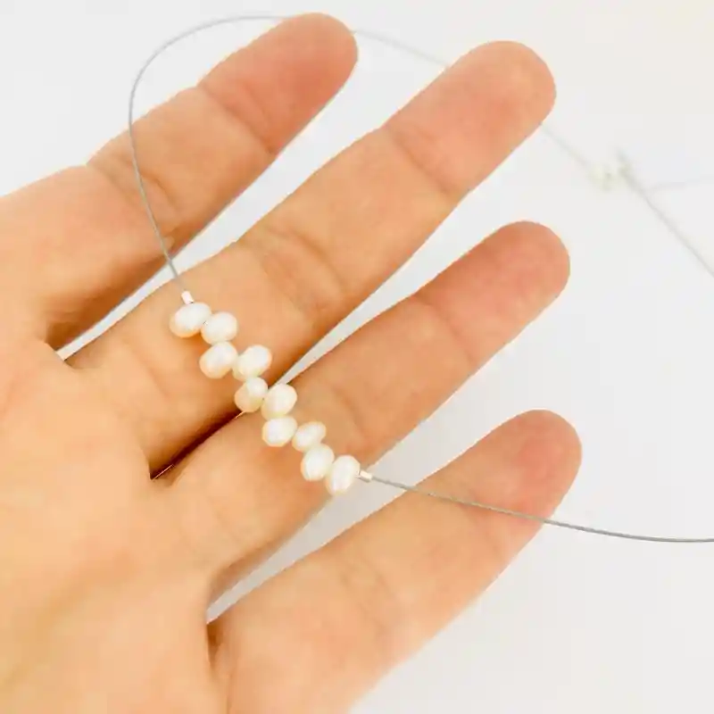 Collar con perlas sobre un hilo de acero flexible y resistente y terminaciones de plata. 42cm de largo.