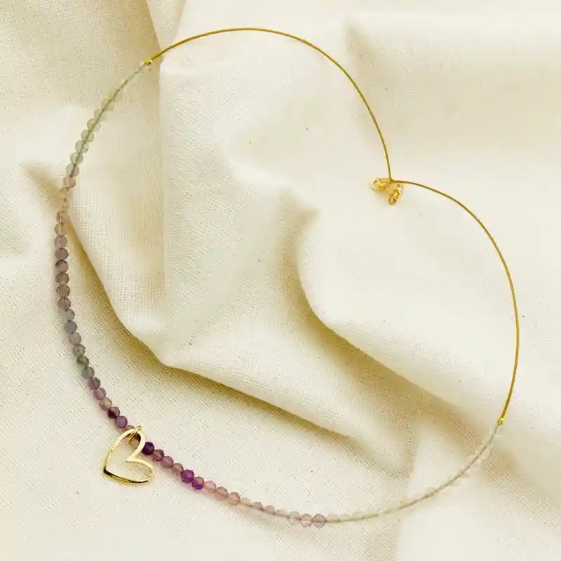 Collar de la marca Caroco con piedras Fluorita naturales en tonos degradados, con un Corazón dorado al centro sobre acero flexible y resistente. El collar mide 42cm. de largo total. Material: bronce bañado en oro de 18k. Recomendaciones de cuidado: Mantén tus joyas separadas unas de otras para evitar que se enreden y se rayen. Evita el uso de forma de directa de químicos como perfumes, cremas y productos de limpieza. Guarda tus accesorios limpios en un lugar seco y lejos del sol y la humedad.