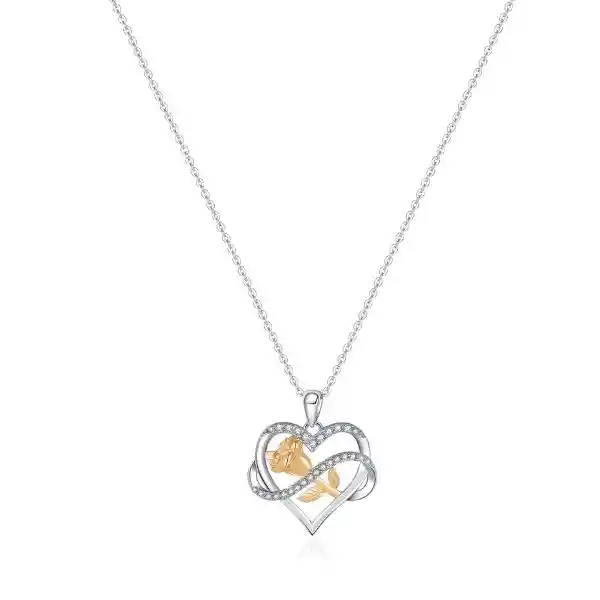 Collar hecho con Cristales Austriacos. Bañado en oro blanco y oro rosado. Color Cristal: Blanco. Tamaño dije: 2,3 cm Largo Cadena: 45 cm más 5 cm de extensión Libre de níquel y plomo. Incluye elegante caja. Metal base: Bronce.