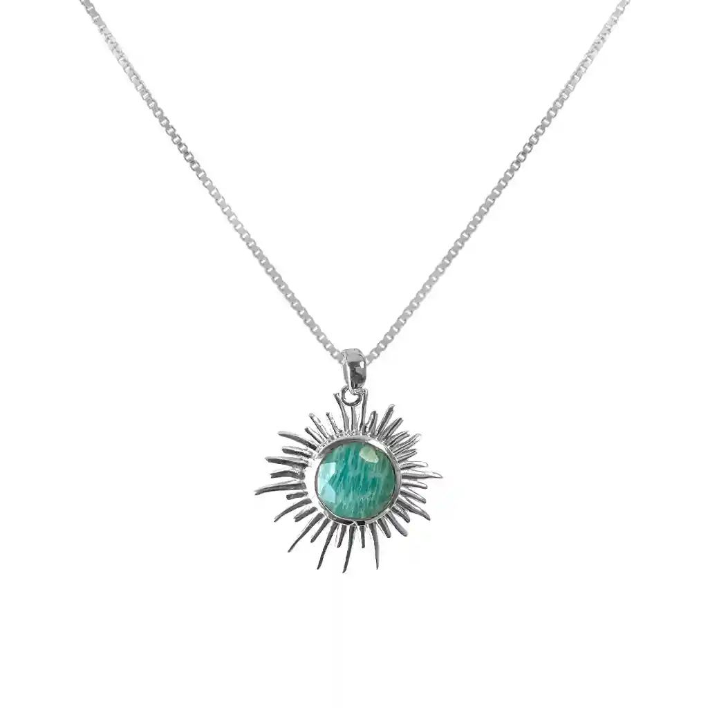 Collar con colgante en forma de sol y piedra natural facetada en el medio, elaborado en plata 925, libre de níquel. Medidas: Cadena de 45cm de largo. Colgante: 3cm de diámetro Piedra: 14mm de diámetro. Amazonita: Claridad mental e intuición 1Mes para cambio