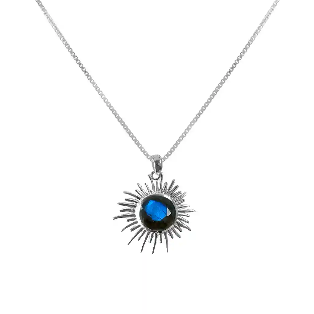 Collar con colgante en forma de sol y piedra natural facetada en el medio, elaborado en plata 925, libre de níquel. Medidas: Cadena de 45cm de largo. Colgante: 3cm de diámetro Piedra: 14mm de diámetro. Labradorita: Energía y creatividad. 1Mes para cambio