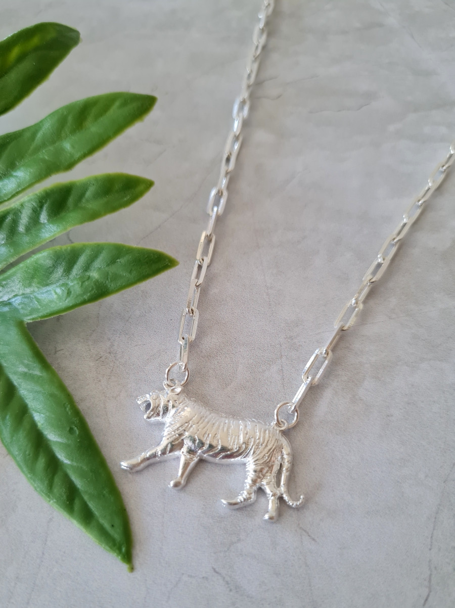 Este collar corto es full ondero para darle luz a tu look. Perfecto para combinarlo con lo que quieras. Tiene una cadena bañada en plata y una tigresa de 3 cm, juntos miden 41 cm. Se entrega envuelto en un papel seda dentro de una preciosa cajita. Perfecta para regalar y quedar como reina.