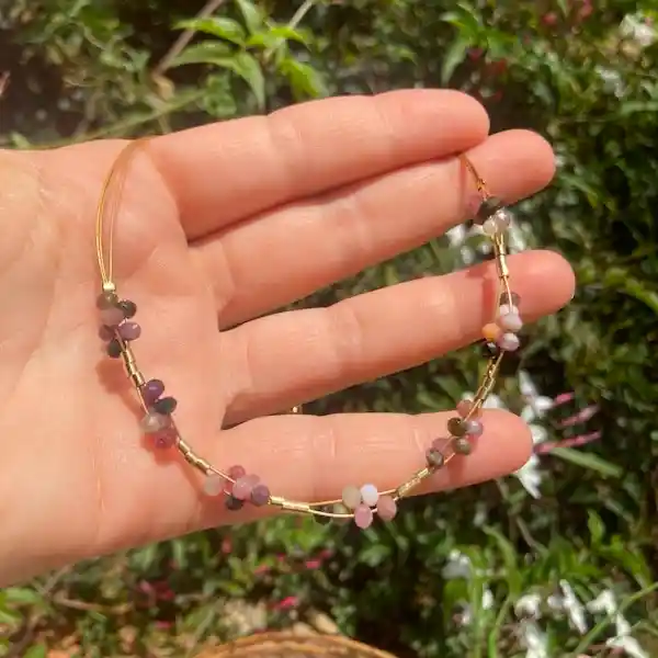 Collar Caroco, con una trenza de piedras Turmalina en pequeños racimos, intercaladas con mostacillas doradas, todo sobre un hilo de acero dorado flexible y resistente. El largo total del collar es de 42cm.