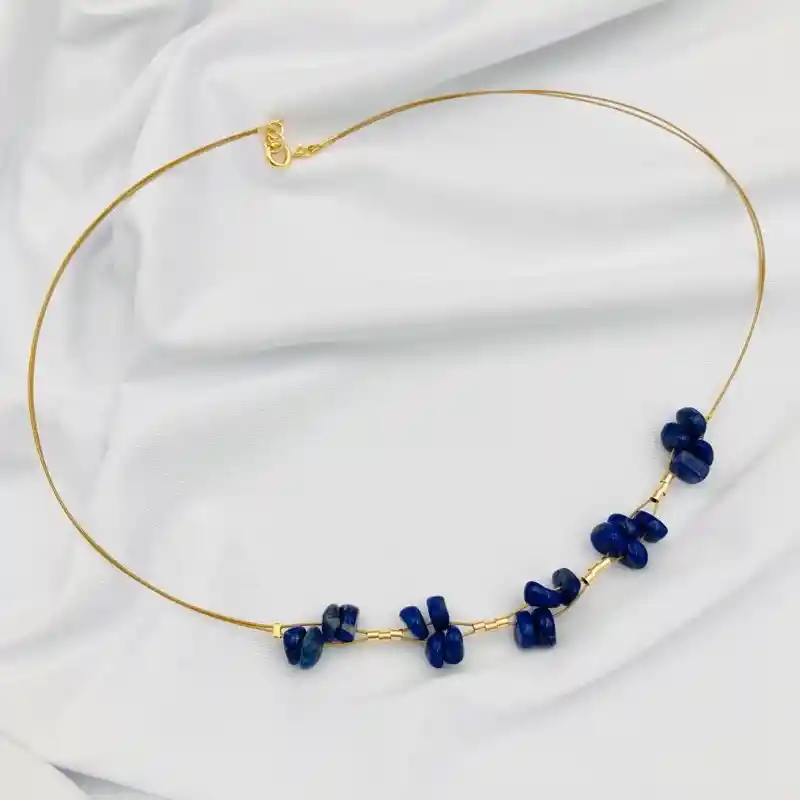 Collar Caroco con piedras naturales Lapislázuli. Dos hilos de acero dorado flexible y resistente, con piedras irregulares en trenza. Largo total de 42cm.
