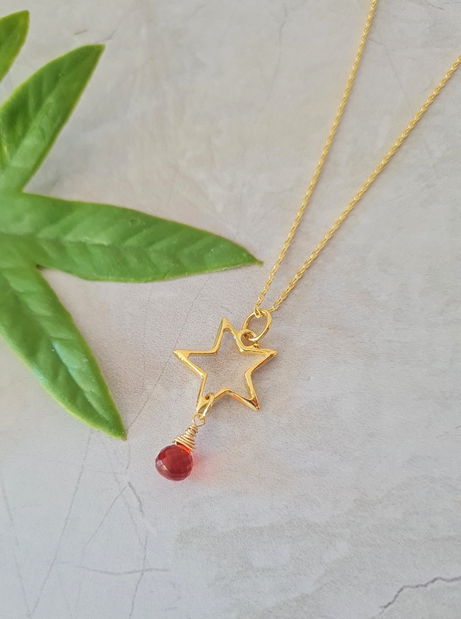 Collar Corto con estrella calada y piedra natural Rubelita . Perfecto para dale un toque de color a tu outfit. La cadena mide 45 cm y es bañada en Oro. Se entrega envuelto en un papel seda dentro de una preciosa cajita. Perfecta para regalar y quedar como reina.