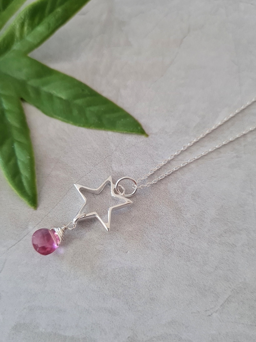 Collar Corto con estrella calada y piedra natural Calcedonia Rosada . Perfecto para dale un toque de color a tu outfit. La cadena mide 45 cm y es bañada en Plata. Se entrega envuelto en un papel seda dentro de una preciosa cajita. Perfecta para regalar y quedar como reina.